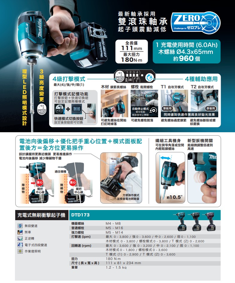 12分鐘前台灣現貨【MAKITA 牧田】 18V鋰電無刷衝擊起子機(DTD173) 日本製 強勁動力 - DTD172【1電1充+塑箱+鑽頭配備】
