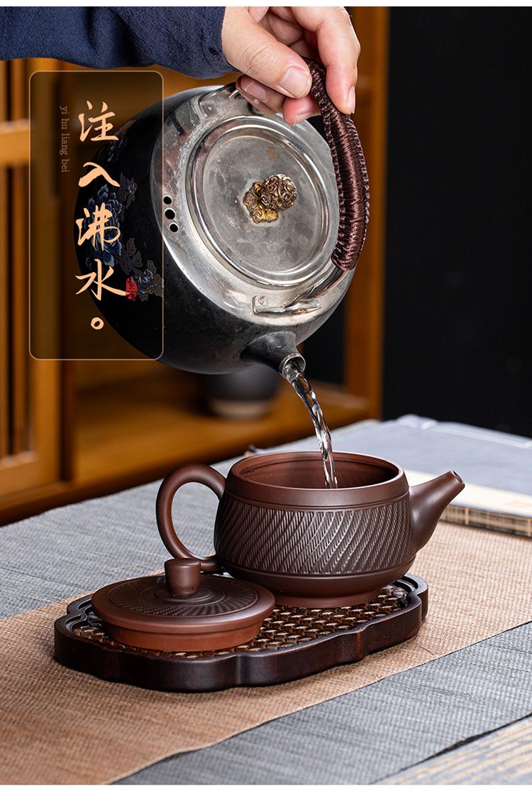 7分鐘前經典傳承・匠心打造|【大師純手工紫陶鳳鳴壺】復古跳刀紋漢瓦壺(一壺兩杯)・黃金大容量300cc + 球孔過濾,鳴音設計顯格調 - 紫陶漢瓦壺【單壺】