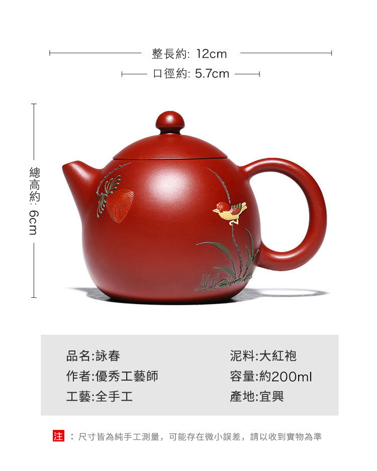 2分鐘前【經典器型 • 別出心裁】正宗宜興原礦大紅袍紫砂壺☞吳敏純手工匠心製作詠春龍蛋一壺四杯 - 大紅袍詠春龍蛋壺200cc